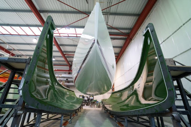 Hull #2 above, is now in the US. ACADIA is shown with the short carbon bow sprit which doubles as an anchor roller and Code sail tack point.